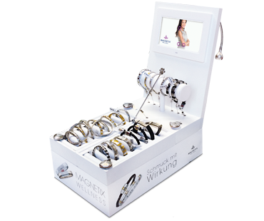 Le kit Deluxe Business peut être utilisé partout, même en votre absence. Une vidéo intégrée présente les atouts des bijoux magnétiques et des bijoux usuels, protégés par un câble en acier. Il est toujours possible de les essayer ! Kit avec 40% de remise, comportant au moins 74 bijoux et accessoires, présentoir de table compact, catalogues, matériels promotionnel et décoratif.